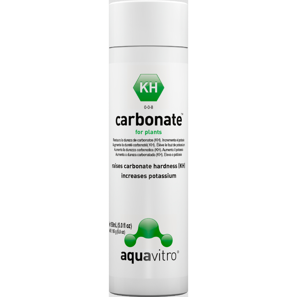AQUAVITRO CARBONATE 150ml é derivado de bicarbonato de potássio. Aumenta tanto a dureza de carbonatos quanto o potássio. A concentração de carbonatos é de 2000 meq/L (5600 dKH). Em adição contém ainda 78,300 mg/L de potássio. A dureza de carbonatos (KH) é a totalidade de carbonatos e bicarbonatos presentes na água. A dureza de carbonatos funciona como efeito tampão de PH e pode também atuar como reserva de CO2 se os níveis deste gás estiverem presentes em valores muito baixos no aquário.