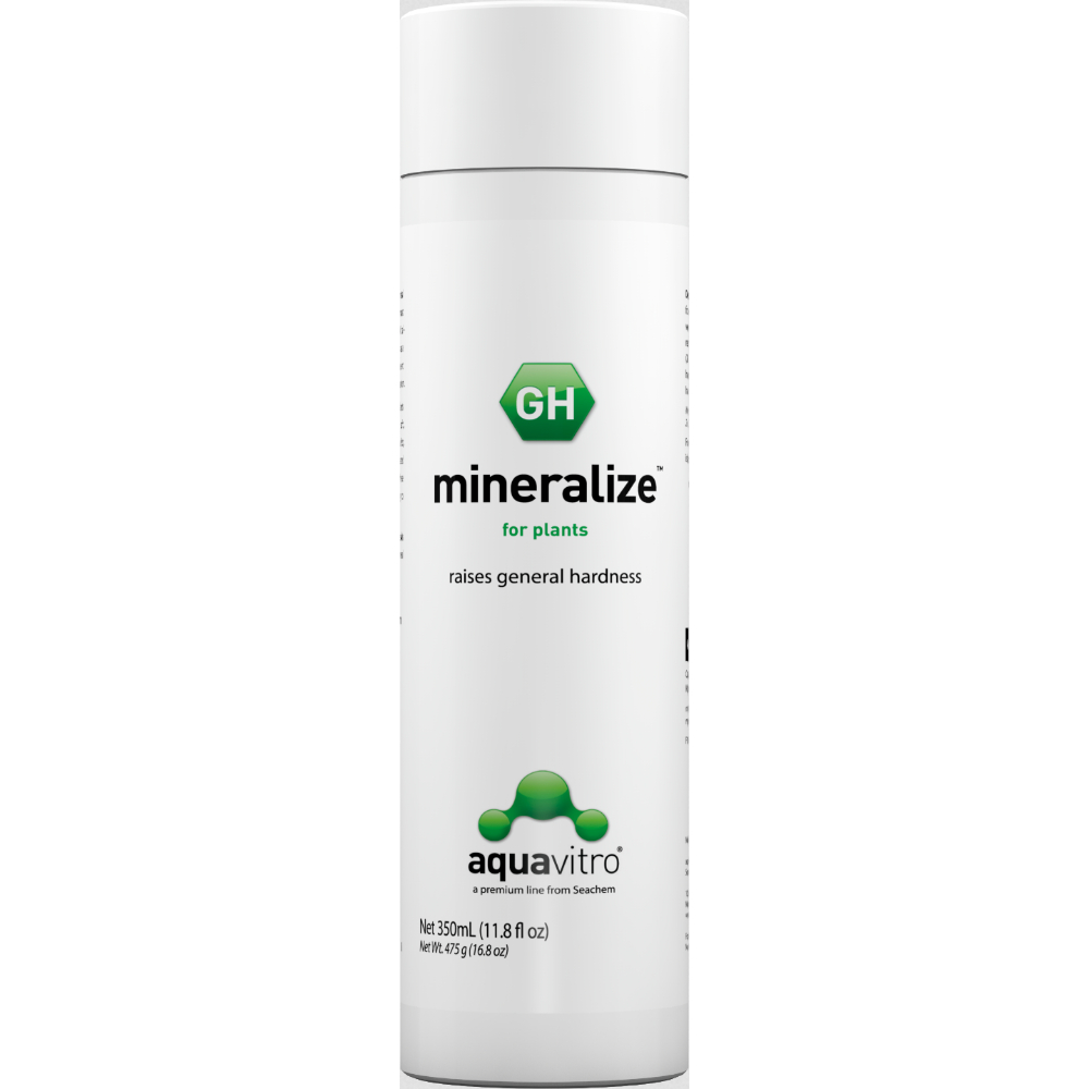 AQUAVITRO MINERALIZE 350ml mistura de sais divalentes com a função de restaurar ou aumentar a dureza total (GH) na água de aquário. A dosagem standard aumenta os valores de GH em 2,8dGH (1 meq/L). A dureza total (GH) é o teor do catião divalente de metal presente na água. Na maior parte dos casos isto é composto principalmente de cálcio e magnésio. Água mole tem uma baixa concentração de catiões divalentes dissolvidos, enquanto que na água mais dura esta concentração é mais alta. O ambiente natural de algumas espécies de plantas (Cryptocoryne, Aponogeton, etc.) é composto por água mole, enquanto que outras espécies (Sagittaria subulata, Riccia fluitans, etc.) estão mais acostumadas a ºaguas duras. De modo a replicar estas condições poderá ser necessário ajustar a dureza total da água.