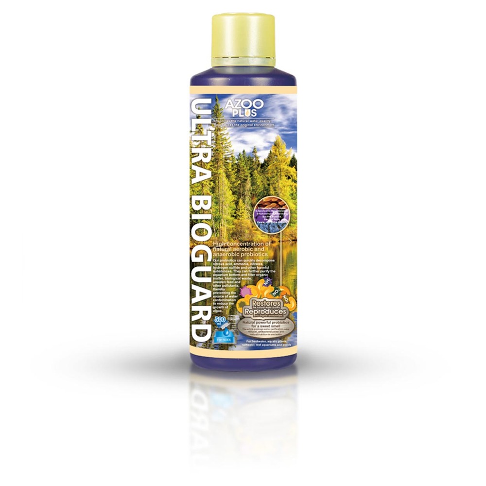 AZOO ULTRA BIOGUARD 250ml acondicionador de água Premium com alta capacidade de decomposição de compostos nitrogenados e matéria orgânica no aquário. Com alta concentração de bactérias aeróbias, anaeróbias e compostos probióticos, rapidamente degrada ácido nitroso, amónia, nitratos, sulfuretos de hidrogénio e outros elementos químicos nocivos, matéria orgânica e outras substâncias. A sua utilização resulta numa purificação do sistema com efeito ao nível da redução dos odores presentes no aquário. O fundo do aquário vê-se livre de todos os restos de alimentos e matéria orgânica em decomposição. Contém abundantes probióticos com um diâmetro celular até 10μm. AZOO ULTRA BIOGUARD PLUS pode ser usado diretamente como alimento para peixes jovens e camarões, ou adicionado à sua alimentação. As suas bactérias e probióticos integram-se rapidamente com a microbiota intestinal como espécies dominantes, resultando em grandes benefícios para os habitantes do aquário, melhorando as funções digestivas, o sistema imunológico e aumentando a taxa de sobrevivência em camarões jovens e alevinos. Reduz significativamente o tempo de ciclagem do aquário. Pode ser usado tanto em sistemas de água doce como lagos e aquários, assim como em sistemas de água salgada. Contém estirpes de bactérias Bacillus e Lactobacillus para a rápida decomposição de amónia, nitratos e nitritos.