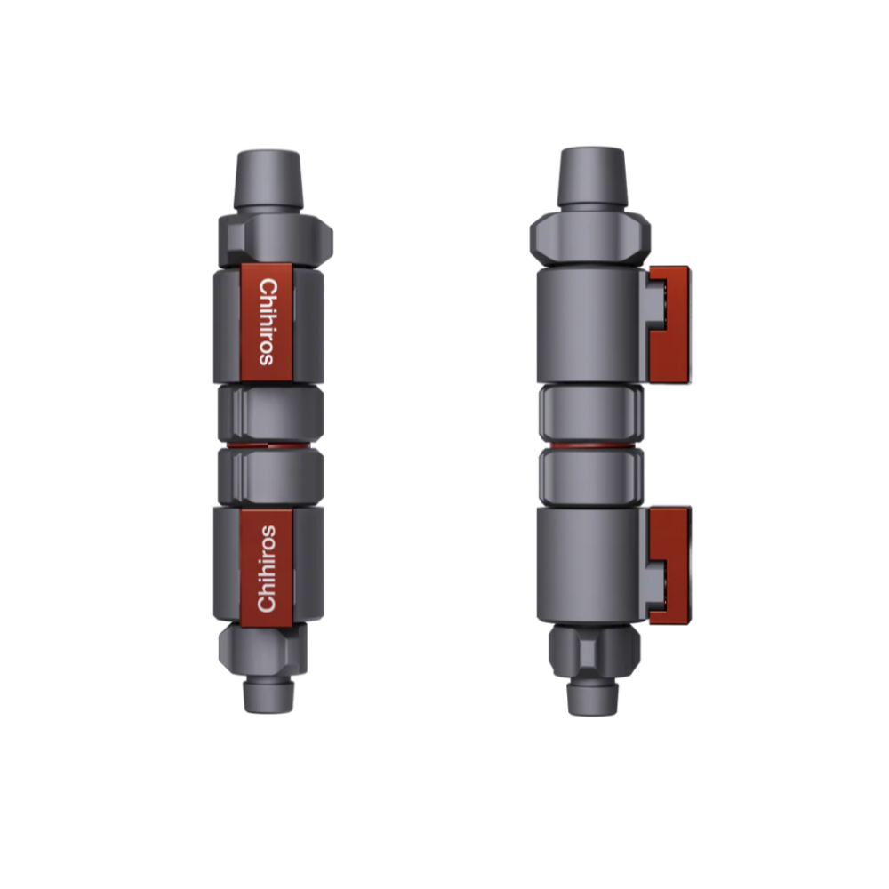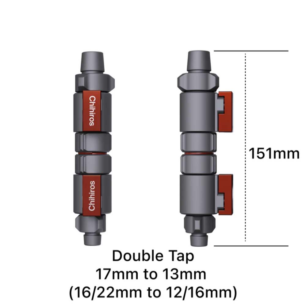 CHIHIROS DOUBLE TAP QUICK CONNECTOR 12/16mm > 16/22mm torneira dupla com conexão rápida e adaptador de tubagem 12/16mm para 16/22mm, para uso em tubagens de filtros externos. Permite 0 corte rápido do fluxo de água para realizar as manutenções e trocas de água, prevenindo fugas de água e refluxo.