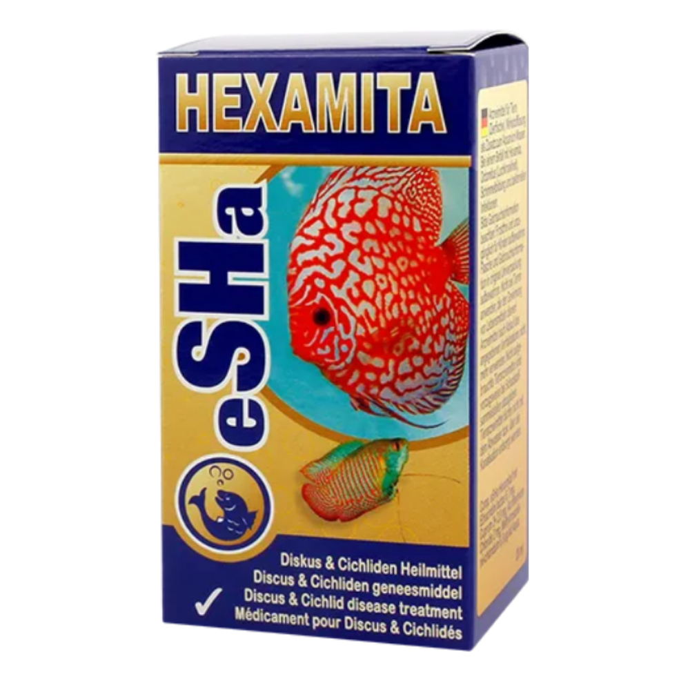 ESHA HEXAMITA 20ml é especialmente formulado para ser usado com Discus e outros ciclídeos como Escalares e Ciclídeos Sul-Americanos. Pode ser usado para tratar eficazmente uma grande variedade de parasitas como Dactylogyrus, desordens intestinais causadas por parasitas internos, viscosidade da pele e doença do buraco na cabeça. ESHA HEXAMITA trata estas enfermidades com sucesso, assim como doenças mais comuns (podridão das barbatanas, dropsia e desordens causadas por fungos). Se os peixes sofre da doença do buraco na cabeça muito comum em discus, podem ficar muito susceptíveis a infecções secundárias. ESHA HEXAMITA é concebido especialmente para tratar a doença do buraco na cabeça (Octomitus). Se virmos pequenos buracos na cabeça ou fluído branco na cabeça dos Discus e outros ciclídeos podemos ter a certeza que o aquário se encontra infectado com o parasita Hexamita. Daí resultam condições que vão desde a perda de apetite, reacções alérgicas dos peixes , escamas levantadas, etc. ESHA HEXAMITA pode ser combinado com ESHA EXIT para uma acção mais ampla. É seguro para o filtro, peixes, plantas, camarões e lagostins. Não é seguro para caracóis. Embalagem de 20ml trata 800 litros de água.