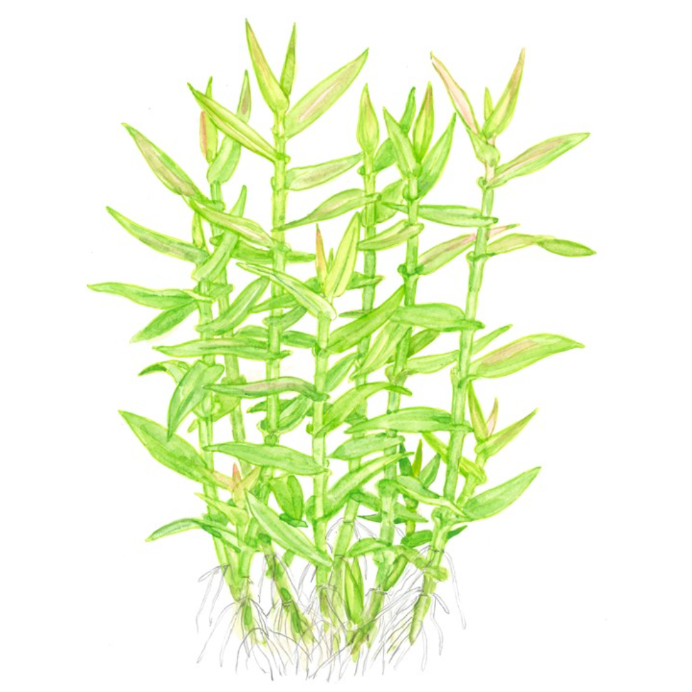 MURDANNIA KEISAK tem a aparência de bambu. Esta espécie chega-nos da Ásia onde cresce em campos de arroz. O seu crescimento é vertical, mas a plantas produz novos estemas quando é podada. As suas folhas têm cor verde claro, com 1cm de largura e 3cm a 5m de comprimento. As pontas mais altas ganham alguma coloração vermelha quando a planta é exposta a luz intensa e CO2. Devido a algum acrescimento mais rápido os estemas mais compridos precisam de cortes e podem ser replantados, de modo a manter o seu aspecto compacto e saudável.