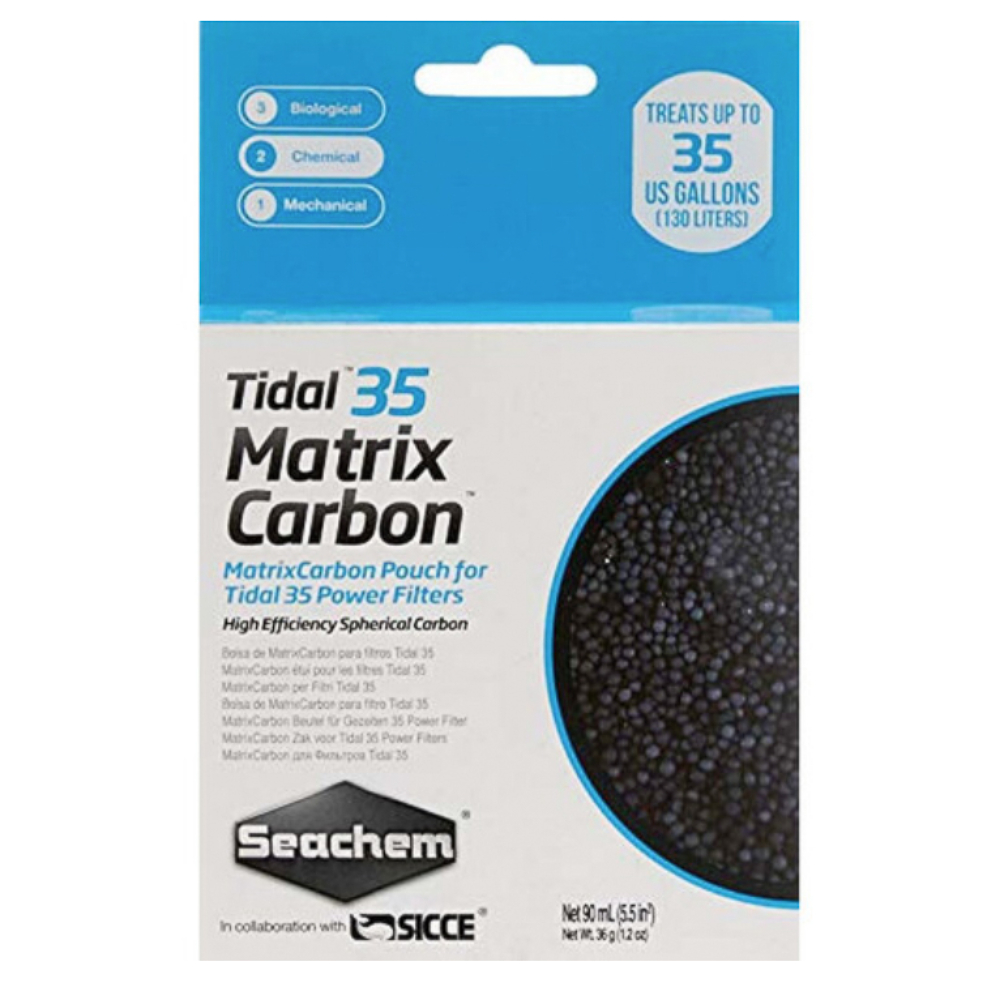 SEACHEM RECARGA MATRIX CARBON P/ TIDAL 35 (90ml) média filtrante SEACHEM MATRIX CARBON com bolsa SEACHEM ZIP BAG incluída, trata até 130 litros. SEACHEM MATRIX CARBON duas vezes mais eficaz que outras marcas disponíveis no mercado, apresentando alta capacidade de remoção de matéria orgânica.