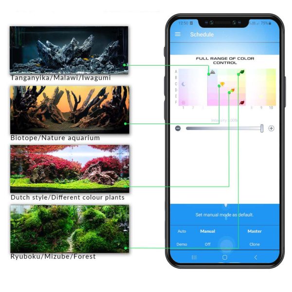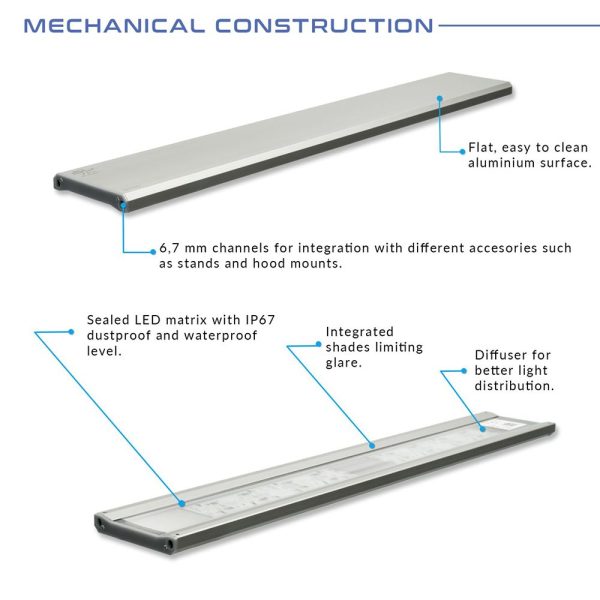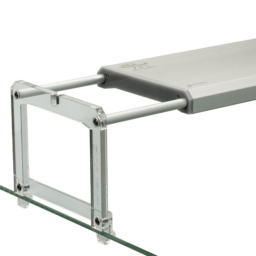 O seu design avançado integra ainda um shade que previne o clarão de luz para o observador do aquário, resultando numa vista muito agradável. As cores e definições programáveis desta unidade para as funções de nascer e pôr-de-sol permitem ajustar a luz da unidade de acordo com as preferências pessoais. Reprodução extremamente natural de das cores de peixes e plantas, em conjunto com a capacidade de se definir o equilíbrio de brancos e temperatura de cor permitem personalizar a luz emitida de acordo com as suas preferências de um modo simples e intuitivo. Fabricada em tamanhos que vão desde os 15cm até aos 150cm, para que cada aquarista possa encontrar o modelo ideal para o seu aquário. A calha pode ser usada em aquários de 149cm a 164cm com o ajuste dos suportes laterais integrados (para mais informações sobre a aplicação da calha consultar imagens abaixo). Fornecida com suportes laterais.